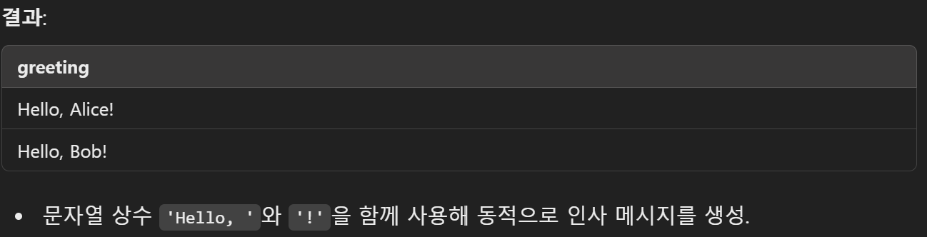 - string1, string2,..., stringN: 연결하려는 문자열. 이 문자열은 열 이름, 문자열 상수, 또는 다른 표현식일 수 있습니다.