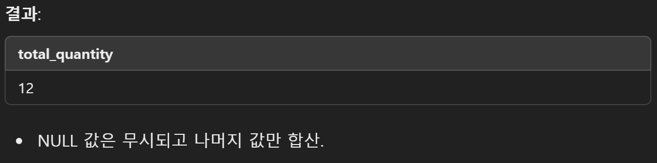 - WHERE condition: 선택적으로 조건을 추가하여 특정 데이터만 합산 가능.