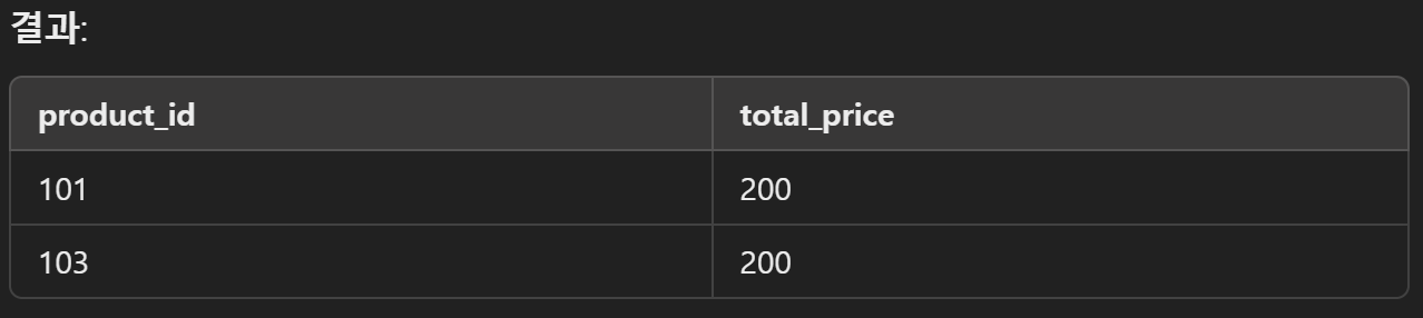 문제: 총합이 200 이상인 product_id만 반환.