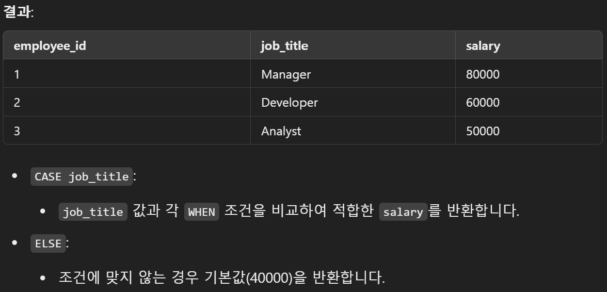- ELSE: 모든 조건이 거짓일 경우 반환할 기본값(생략 가능).