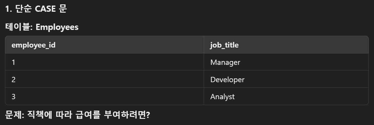 "CASE" 문은 조건에 따라 다른 값을 반환하거나, 특정 로직을 수행할 때 사용하는 제어 흐름 구문입니다. CASE는 SQL의 조건문(if-else)과 유사하며, SELECT, WHERE, ORDER BY, GROUP BY 등 다양한 구문에서 사용할 수 있습니다.