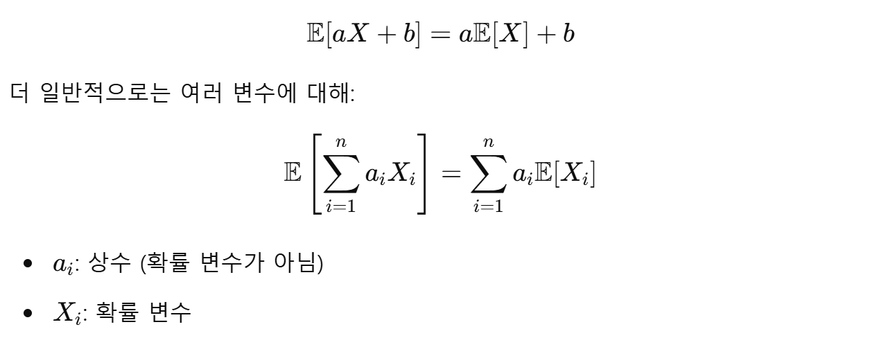 기댓값은 단순히 평균을 의미할 뿐만 아니라, 선형성(linearity)이라는 매우 강력한 수학적 성질을 갖고 있다.