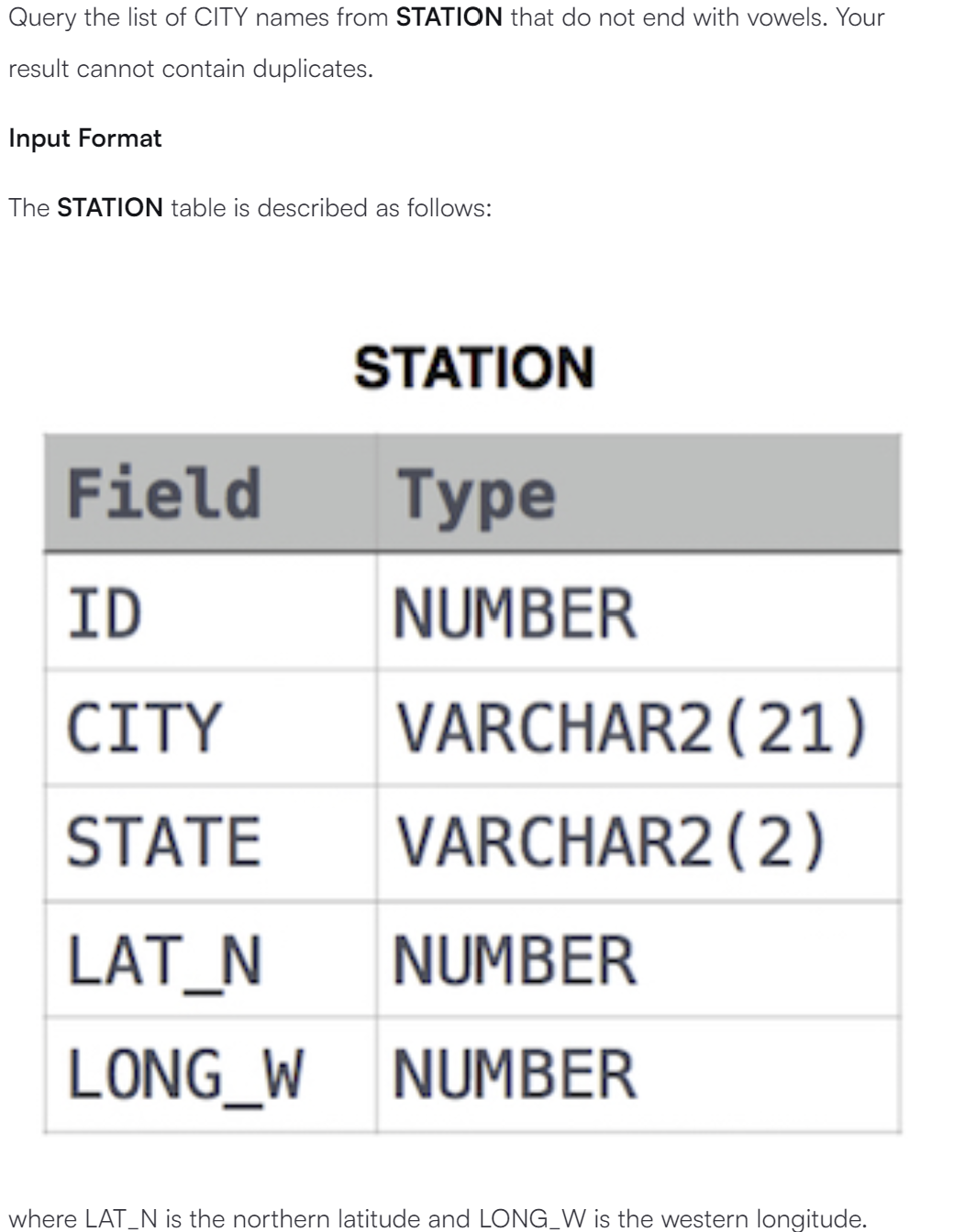 WHERE CITY REGEXP '[^aeiouAEIOU]$';'SQL > 문제풀이' 카테고리의 다른 글