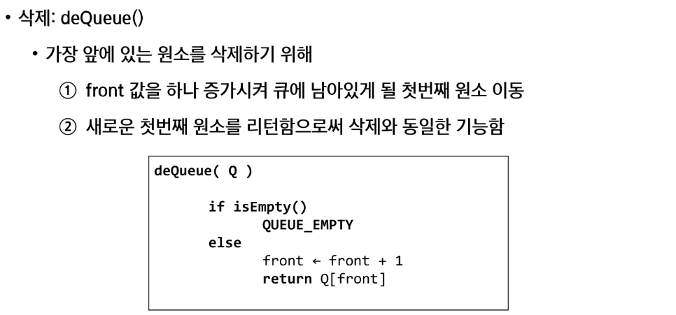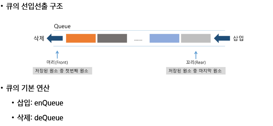 - 스택과 마찬가지로 삽입과 삭제의 위치가 제한적인 자료구조
