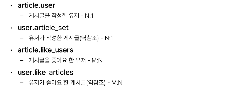 - 'user가 작성한 글 (user.article_set)'과 'user가 좋아요를 누른 글(user.article_set)'을 구분할 수 없게 됩니다.