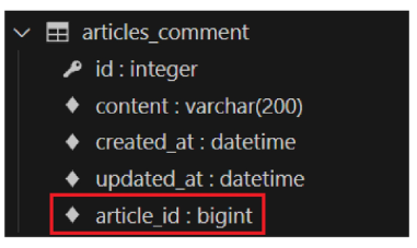 ForeignKey() 클래스의 인스턴스 이름은 참조하는 모델 클래스 이름의 단수형으로 작성하는 것을 권장합니다. ForiegnKey 클래스를 작성하는 위치와 관계없이 외래 키는 테이블 필드 마지막에 생성됩니다.