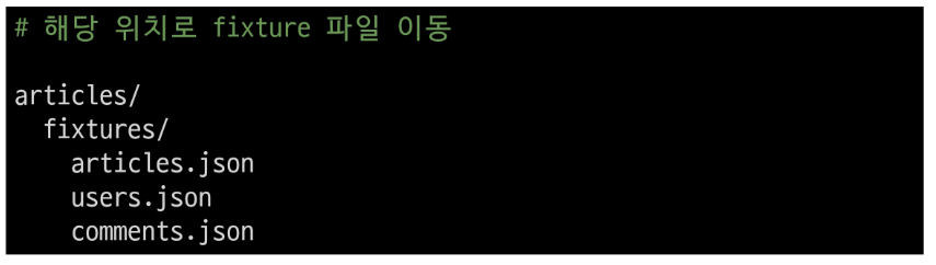 Fixtures 파일 기본 경로는 app_name/fixtures/ 로 Django는 설치된 모든 app의 디렉터리에서 fixtures 폴더 이후의 경로로 fixtures 파일을 찾아 load 합니다.