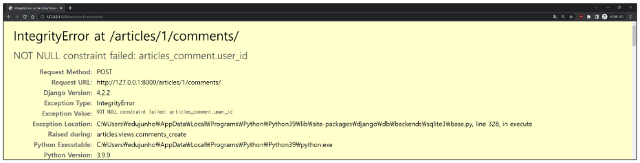 댓글의 user_id 필드 데이터가 누락되었기 때문입니다.