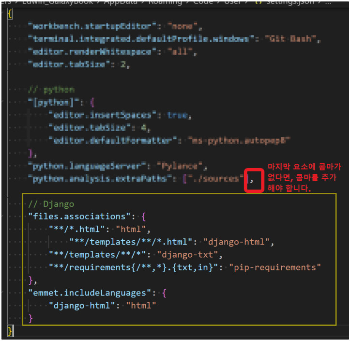 - 아래의 코드를 붙여넣은 후, 저장(ctrl + s) 합니다. (참고: 생략된 다른 설정 코드는 개인마다 차이가 있을 수 있습니다.)