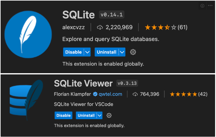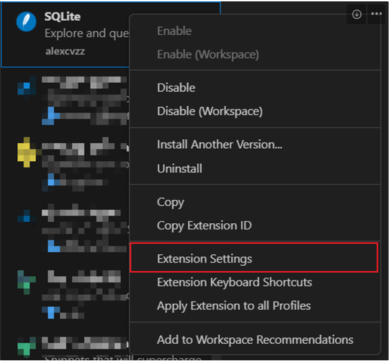 - SQLite 확장 프로그램 우클릭 → Extension Settings 선택