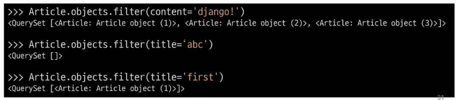 - 객체를 찾을 수 없으면 DoesNotExist 예외를 발생시키고, 둘 이상의 객체를 찾으면 MultipleObjectsReturned 예외를 발생시킵니다.