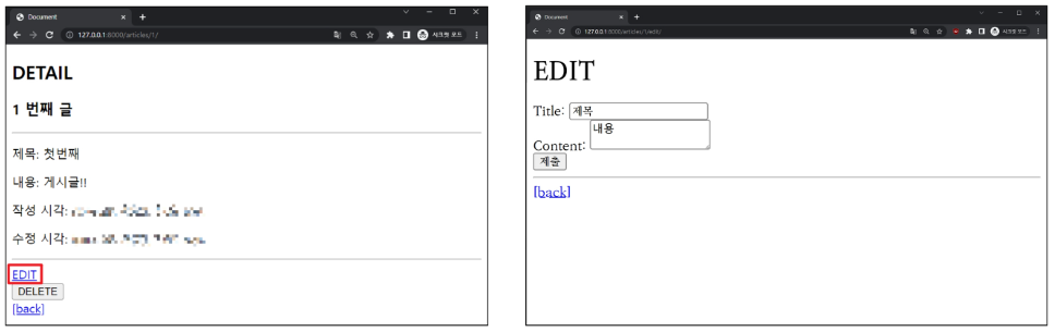 Update 로직을 구현하기 위해 필요한 view 함수의 개수는 몇 개일까요? 사용자 입력 데이터를 받을 페이지를 렌더링 하는 edit과 사용자가 입력한 데이터를 받아 DB에 저장하는 update, 이렇게 두 개가 있습니다.