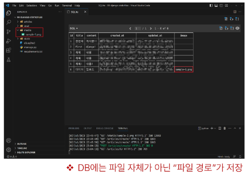 이미 업로드에 사용하는 모델 필드로 이미지 객체가 직접 저장되는 것이 아닌 '이미지 파일의 경로'가 문자열로 DB에 저장됩니다.
