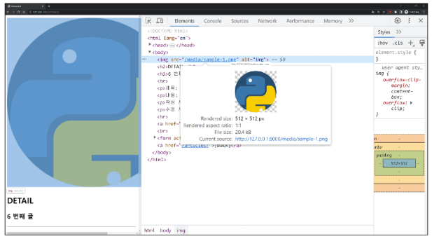 이미지를 업로드하지 않은 게시물은 detail 템플릿을 렌더링 할 수 없습니다. 이미지 데이터가 있는 경우에만 이미지를 출력할 수 있도록 처리해야 합니다.