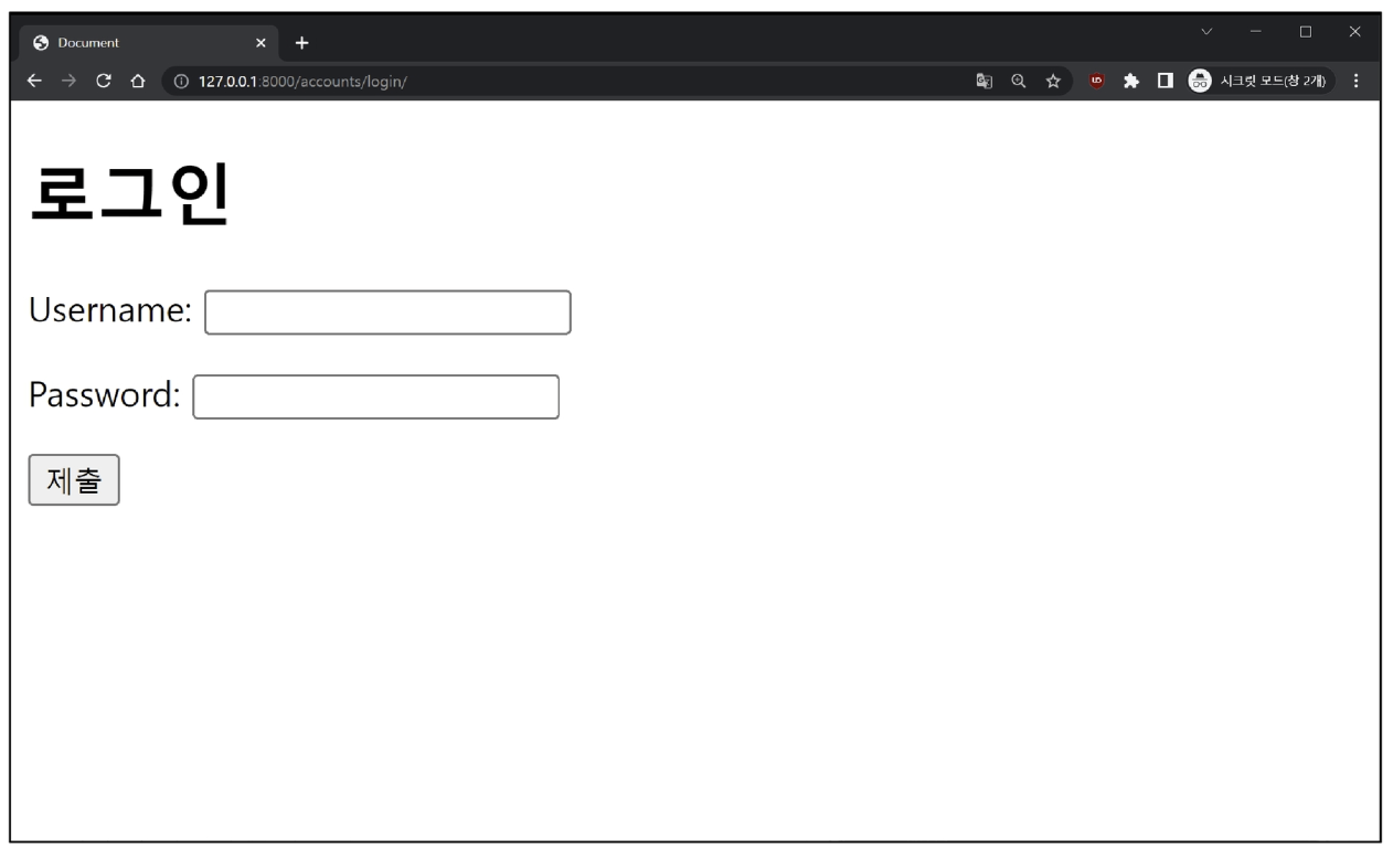 - login(request, user): AuthenticationForm을 통해 인증된 사용자를 로그인하는 함수입니다.