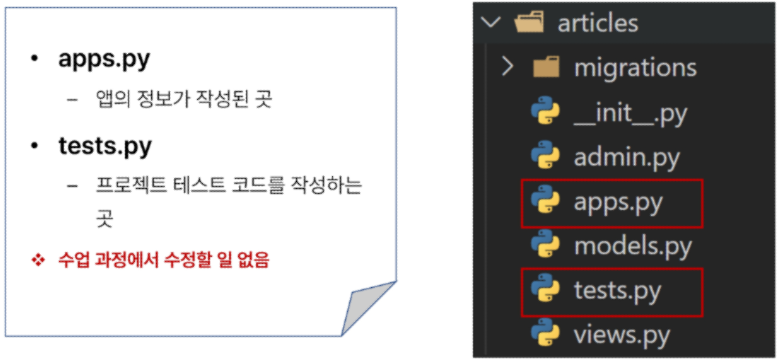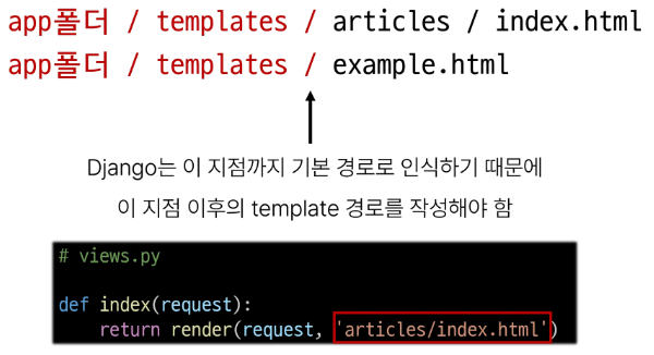 - articles 앱 폴더 안에 templates 폴더 생성 (폴더명은 반드시 templates이어야 하고 개발자가 직접 생성해야 합니다!!)