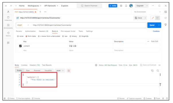 CommentSerializer에서 외래 키에 해당하는 article field 또한 사용자로부터 입력받도록 설정되어 있기 때문에 서버 측에서 누락되었다고 판단한 것입니다.