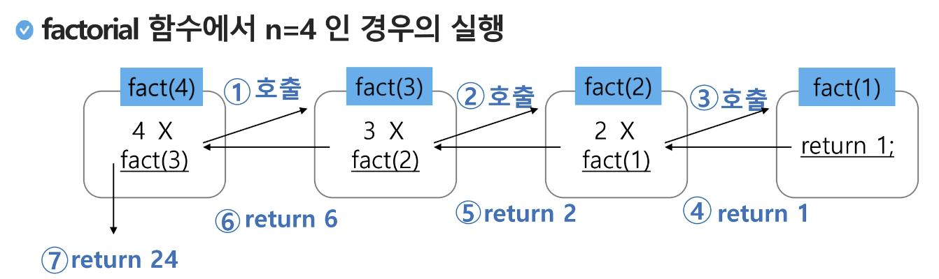 - 함수에서 실행해야 하는 작업의 특성에 따라 일반적인 호출방식보다 재귀호출방식을 사용하여 함수를 만들면 프로그램의 크기를 줄이고 간단하게 작성할 수 있습니다.