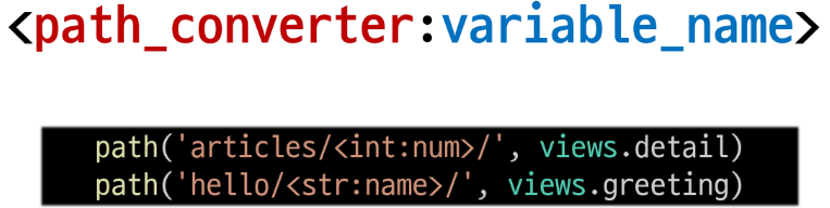 위에서 int, str과 같은 URL 변수의 타입을 Path converters라고 하고 5가지 타입을 지원합니다.