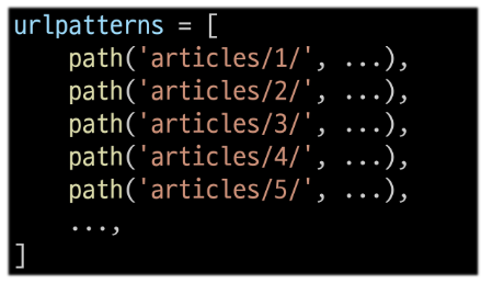 앞서 설명드린 URL 관리의 문제점은 템플릿의 많은 부분이 중복되고, URL의 일부만 변경되는 상황이라면 계속해서 비슷한 URL과 템플릿을 작성해야 하는 것입니다.