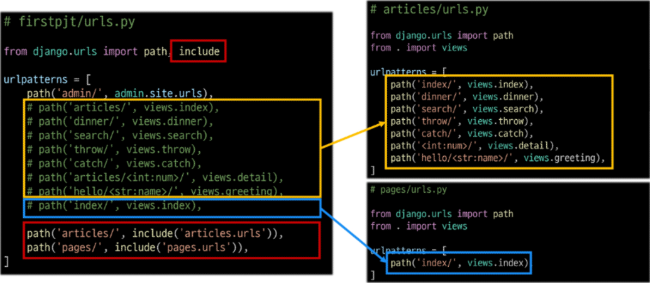 2번째 앱 pages 생성 후 발생할 수 있는 문제는 view 함수 이름이 같거나 같은 패턴의 url 주소를 사용하게 되는 경우가 있습니다. 이를 해결하기 위해서는 아래 코드와 같이 해결할 수 있으나 더 좋은 방법이 필요합니다. 따라서, URL을 각자 app에서 관리해서 문제를 해결할 수 있습니다.