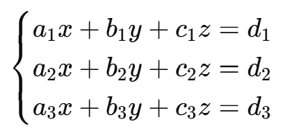 이 문제는 3차원 공간에서의 세 평면의 교점을 구하는 것으로 해석할 수 있습니다.