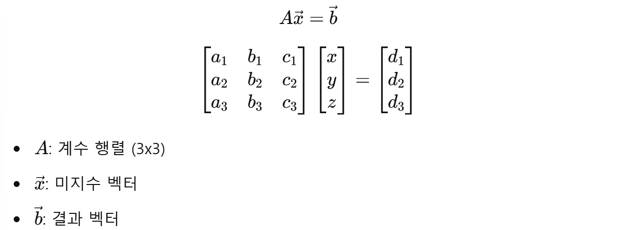 3개의 미지수 x, y, z에 대해 3개의 선형 방정식이 주어진 경우, 이 시스템의 해를 찾는 것이 목표입니다.