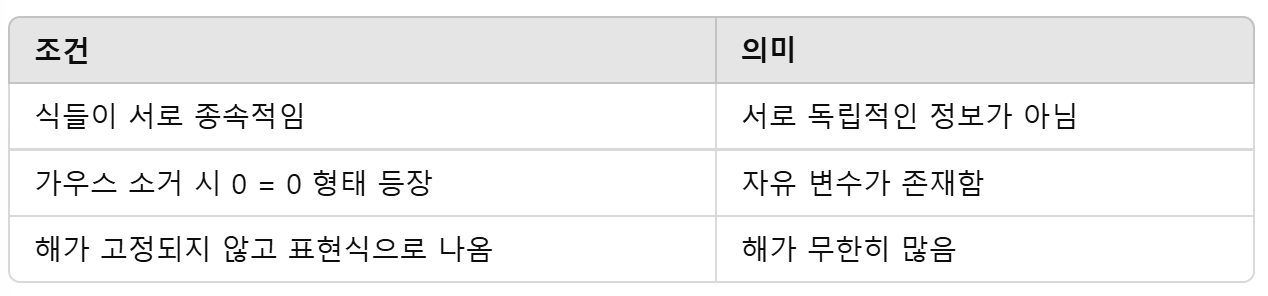 이는 식들 간에 의존성(종속성)이 있어서 실제로는 독립적인 정보가 부족할 때 발생합니다.
