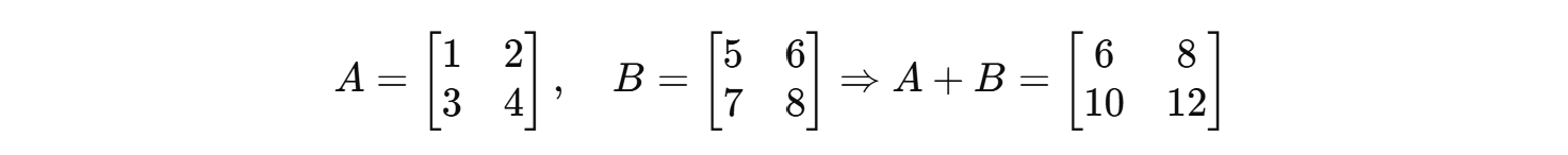 두 행렬 A, B가 같은 크기일 때, 덧셈은 같은 위치의 원소끼리 더해서 새 행렬을 만듭니다.