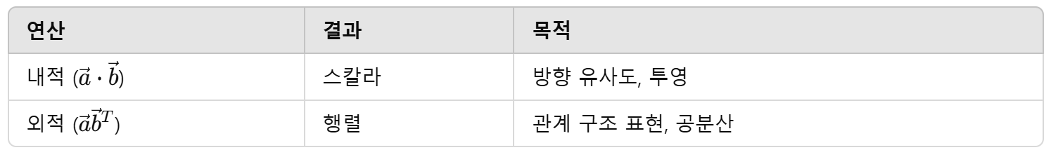 - 내적은 방향의 유사도를 계산하는 반면, 외적은 전체적인 구조와 관계를 표현하는 데 적합합니다.