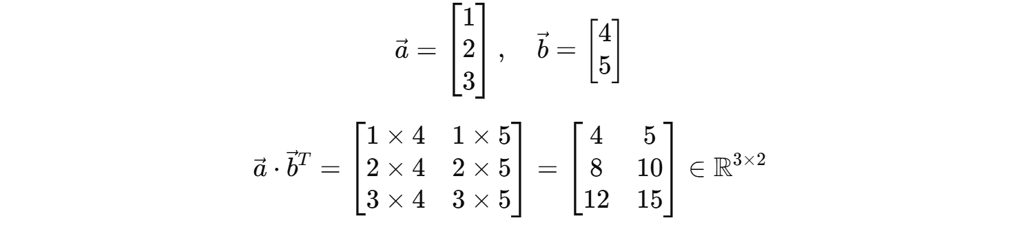 Outer product(외적)은 두 벡터의 곱을 통해 행렬을 생성하는 연산입니다.