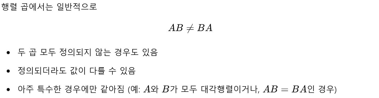 행렬 곱은 단순한 숫자 곱과는 달리 조심해야 할 성질들이 있습니다.