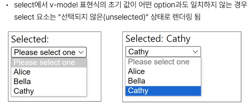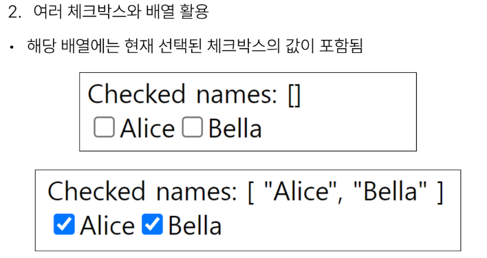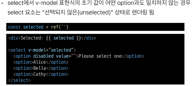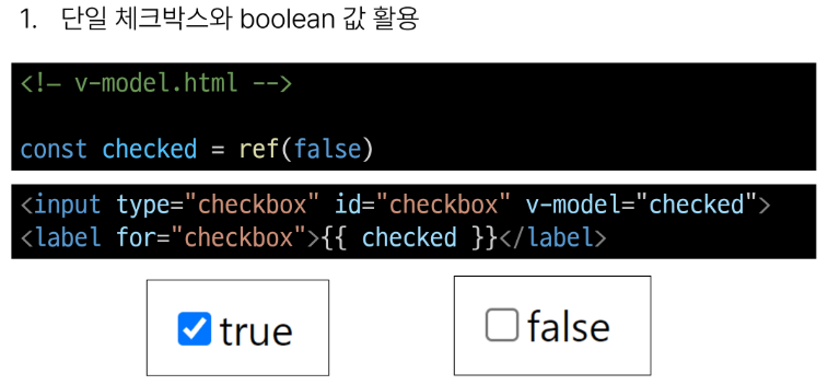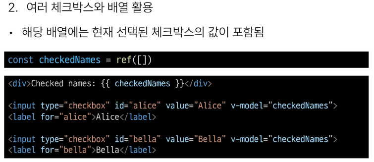 v-model은 단순 text input 뿐만 아니라 Checkbox, Radio, Select 등 다양한 타입의 사용자 입력 방식과 함께 사용 가능합니다.