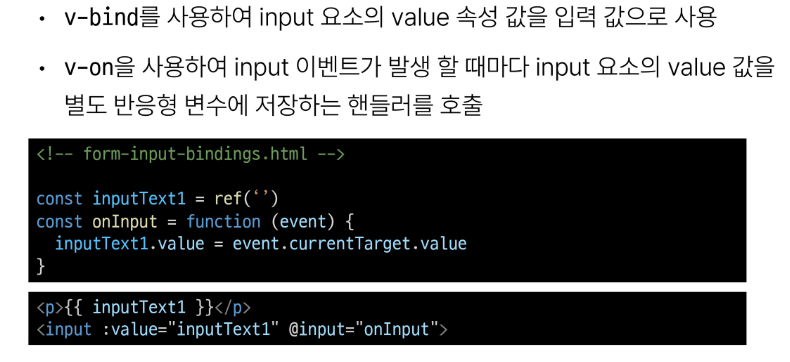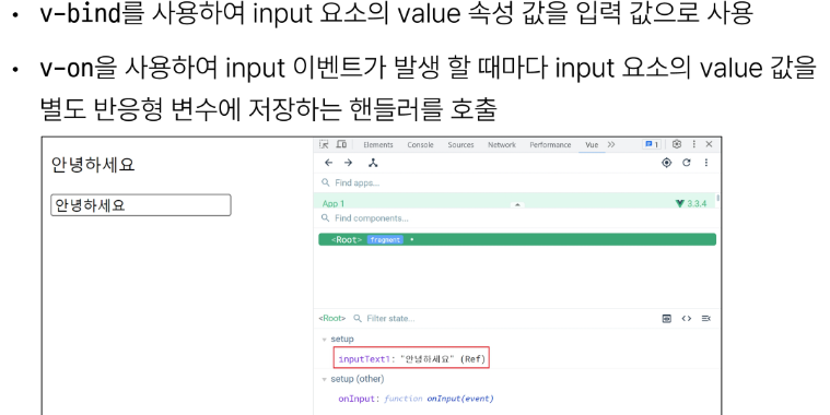 v-model이란, form input 요소 또는 컴포넌트에서 양방향 바인딩을 만듭니다.