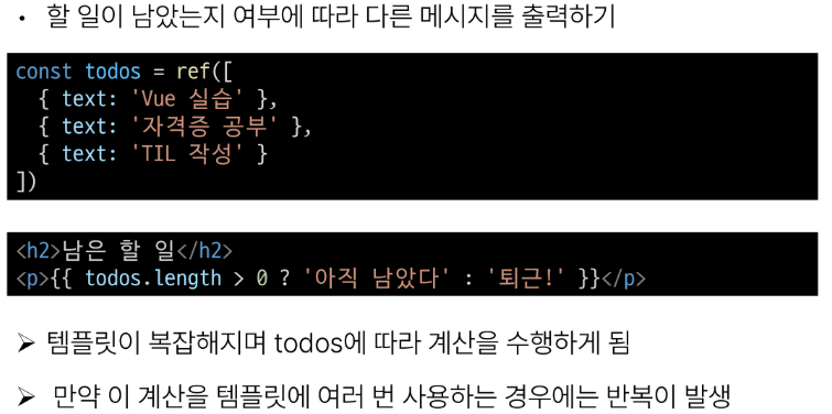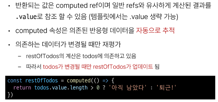computed()는 계산된 속성을 정의하는 함수입니다. 미리 계산된 속성을 사용하여 템플릿에서 표현식을 단순하게 하고 불필요한 반복 연산을 줄입니다.