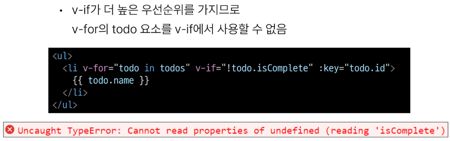 동일한 요소에 v-for와 v-if를 함께 사용하지 않습니다. 동일한 요소에서 v-if가 v-for보다 우선순위가 더 높기 때문입니다. 즉, v-if 조건은 v-for 범위의 변수에 접근할 수 없습니다.