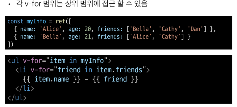 반드시 v-for와 key를 함께 사용해야합니다. 내부 컴포넌트의 상태를 일관되게 유지해야 하는데 즉, 데이터의 예측 가능한 행동을 유지(Vue 내부 동작 관련) 하기 위해서입니다.