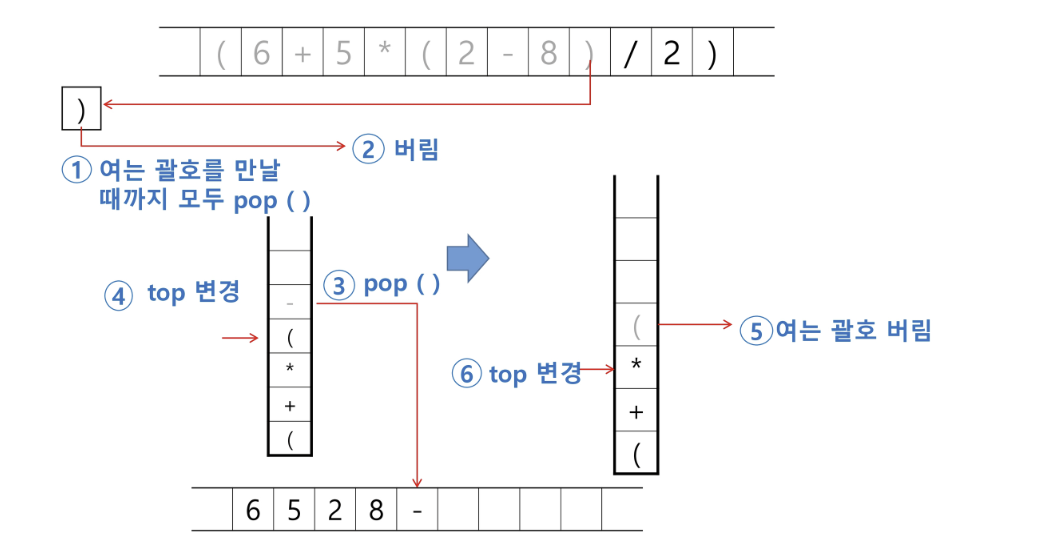 - 토큰이 오른쪽 괄호 ')'이면 스택 top에 왼쪽 괄호 '('가 올 때까지 스택에 pop 연산을 수행하고 pop 한 연산자를 출력합니다. 왼쪽 괄호를 만나면 pop만 하고 출력하지는 않습니다.