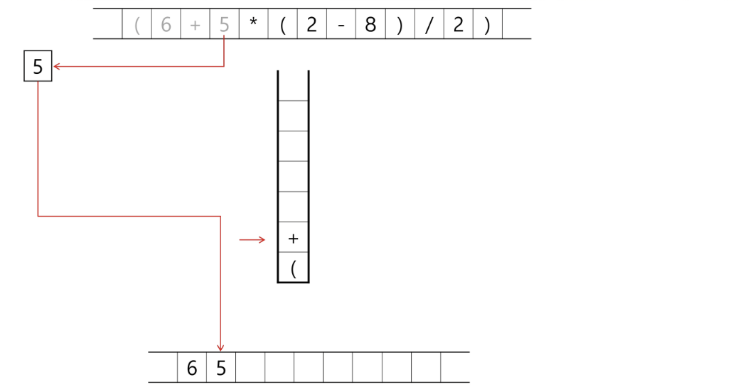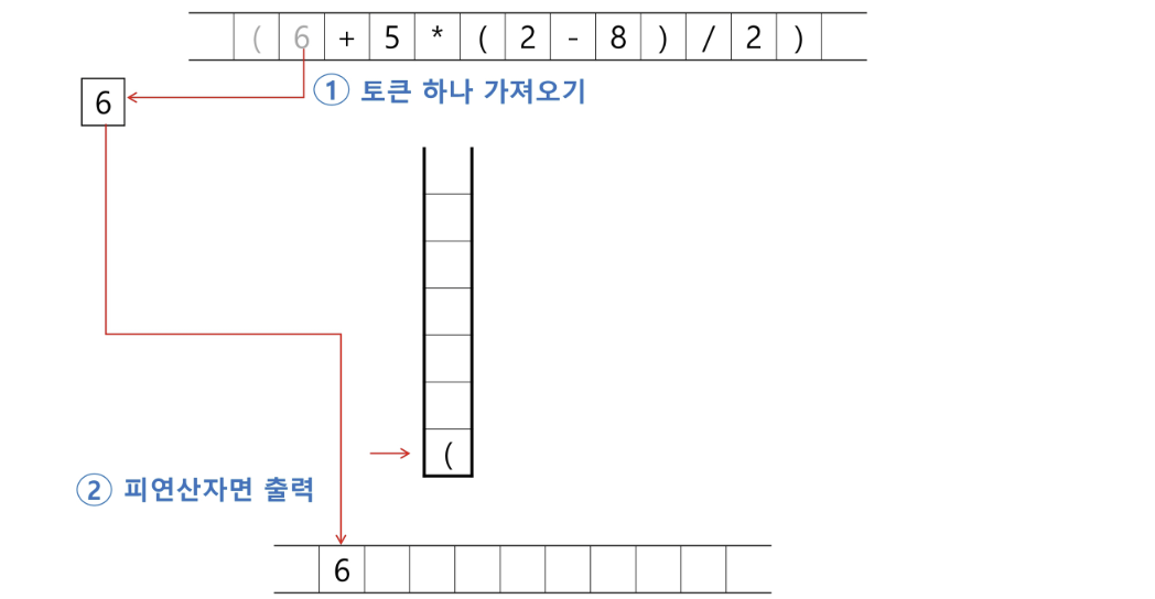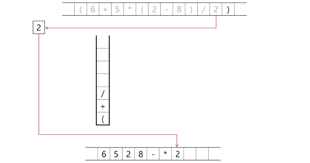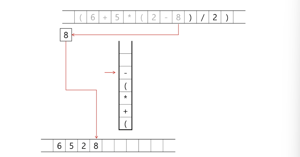 - 중위 표기식에 더 읽을 것이 없다면 중지하고, 더 읽을 것이 있다면 1부터 다시 반복합니다.