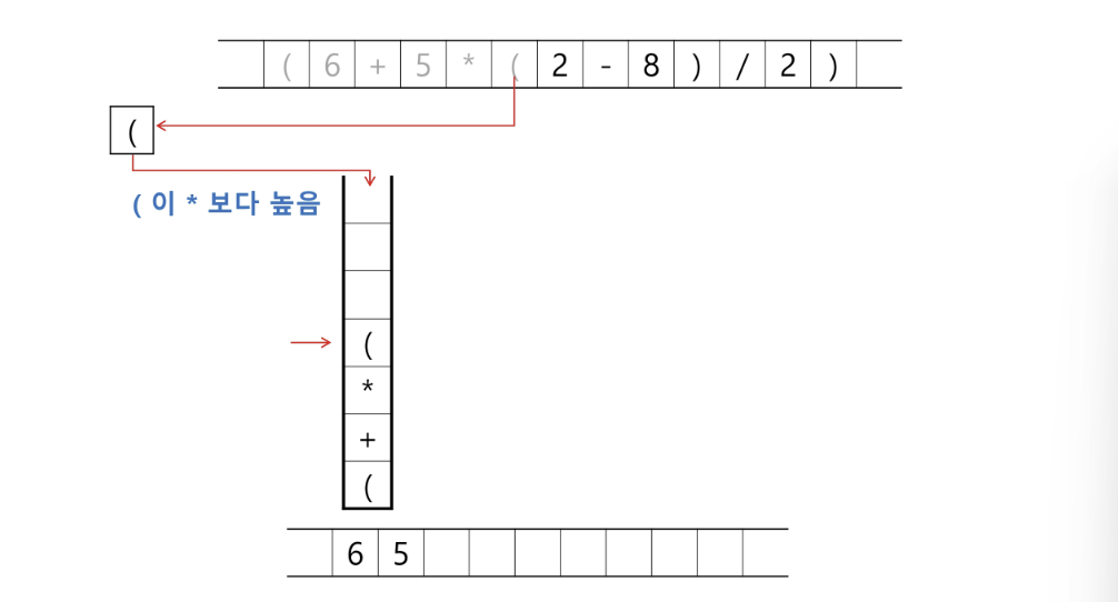 - 스택에 남아 있는 연산자를 모두 pop 하여 출력합니다. (스택 밖의 왼쪽 괄호는 우선순위가 가장 높으며, 스택 안의 왼쪽 괄호는 우선 순위가 가장 낮습니다.)