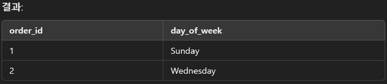 SELECT order_id, DATE_FORMAT(order_date, '%W') AS day_of_week