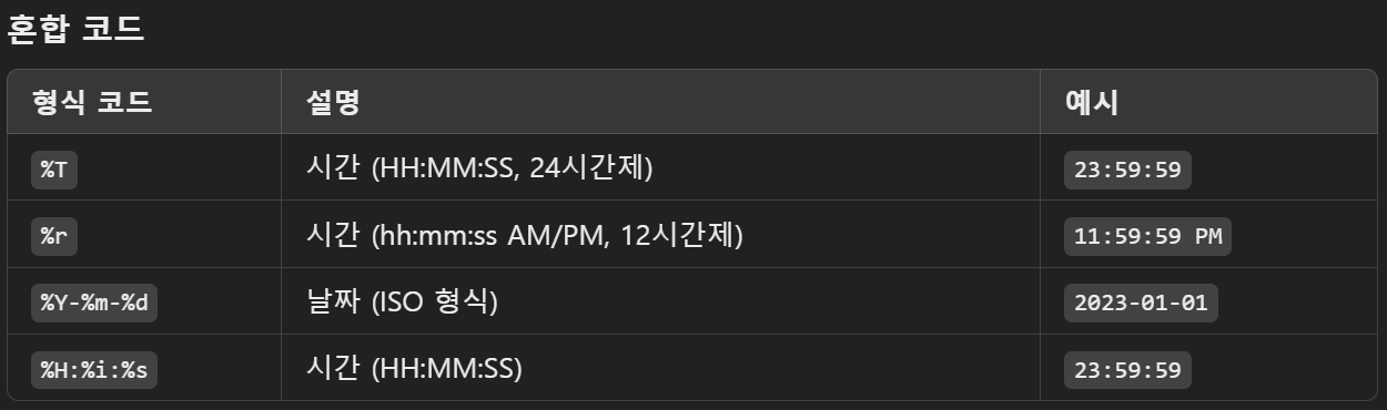 "DATE_FORMAT" 함수는 날짜 및 시간 데이터를 지정된 형식으로 변환하는 데 사용됩니다. MySQL과 같은 DBMS에서 주로 사용되며, 출력 결과를 사람이 읽기 쉽게 하거나 특정 패턴에 맞춰 변환하는 데 유용합니다.