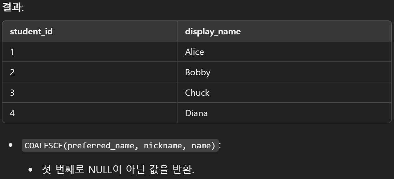 - COALESCE는 NULL 값을 반환하지 않습니다(모든 값이 NULL인 경우 제외).