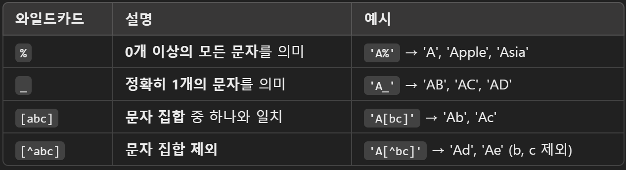 "LIKE" 연산자는 특정 패턴과 일치하는 문자열을 검색하는 데 사용됩니다. 단순히 문자열을 비교하는 = 연산자와 달리, 와일드카드를 사용하여 보다 유연하게 패턴 매칭을 수행할 수 있습니다.