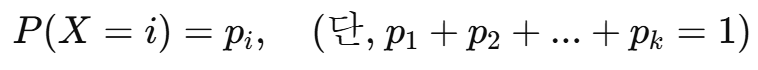 확률 변수가 X가 k개의 가능한 범주를 가질 때, 범주형 분포는 이렇게 표현된다.