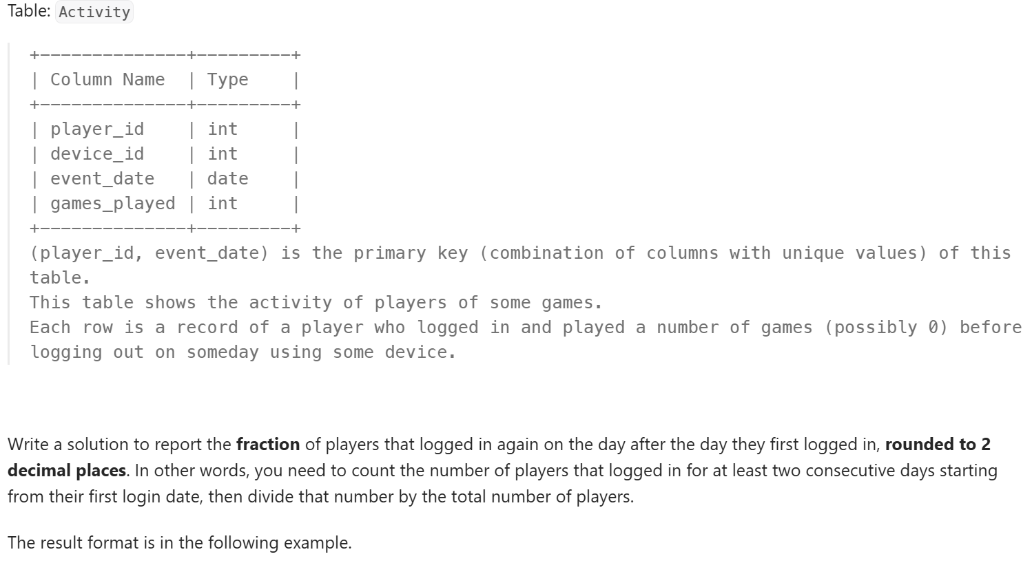 SELECT ROUND(COUNT(DISTINCT(player_id)) / (SELECT COUNT(DISTINCT(player_id)) FROM Activity), 2) AS fraction