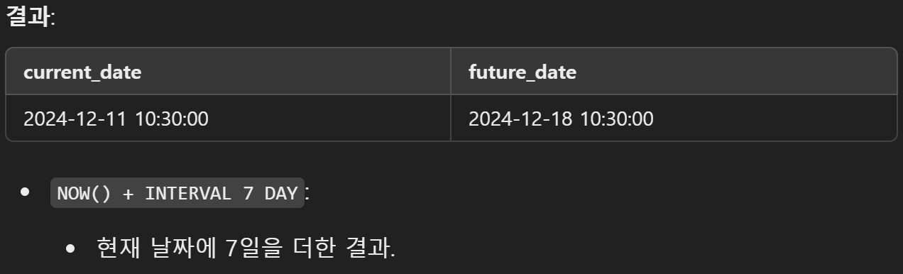 NOW() + INTERVAL 7 DAY AS future_date;