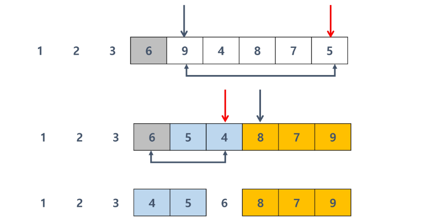 - 병합 정렬과 다른 점은 병합 정렬은 그냥 두 부분으로 나누는 반면에, 퀵 정렬은 분할할 때, 기준 아이템(pivot item) 중심으로, 이보다 작은 것은 왼편, 큰 것은 오른편에 위치시킵니다.