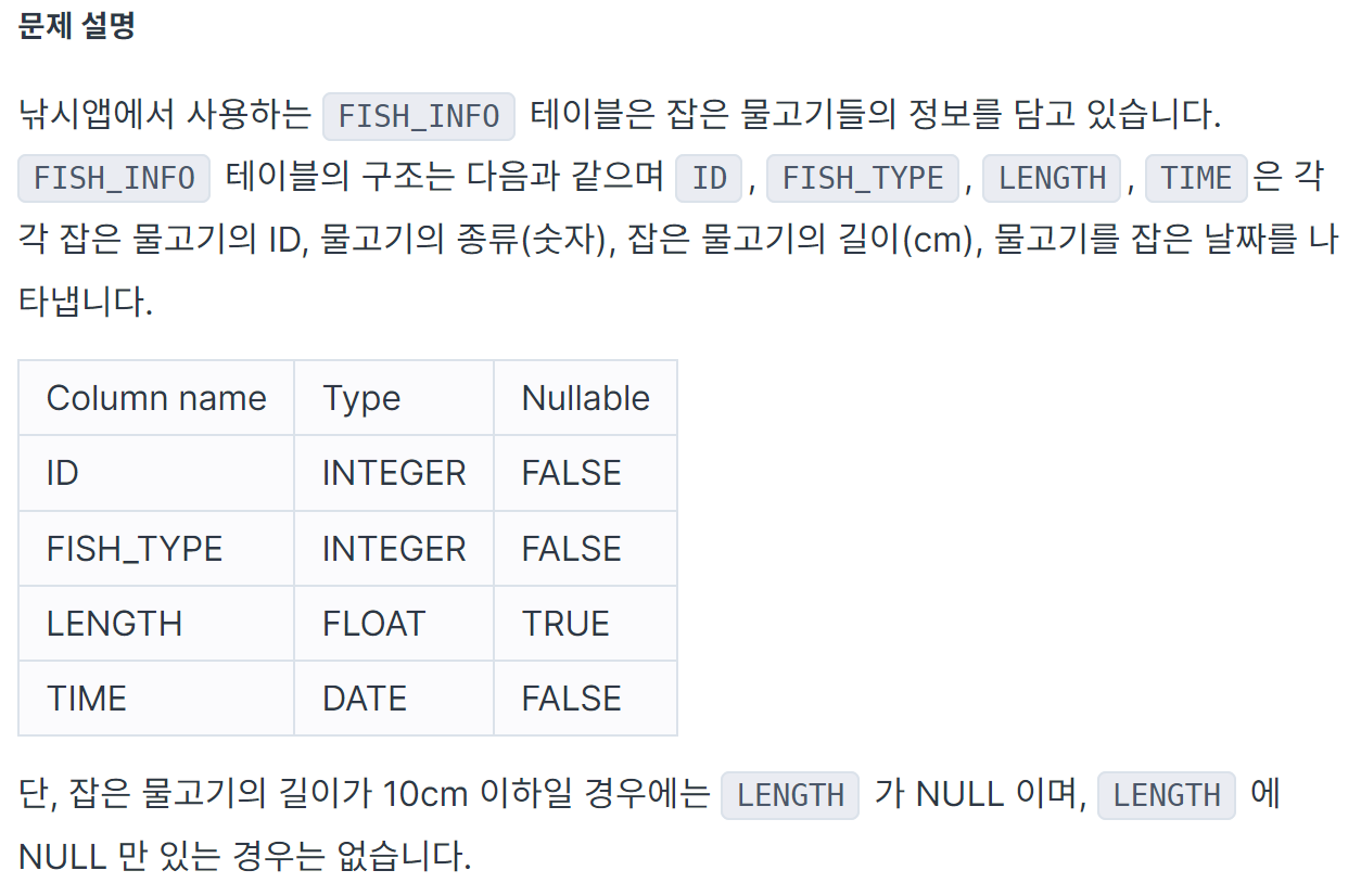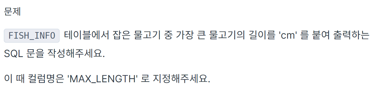 'NULL이 아닌 값을 제외하고 LENGTH를 내림차순으로 정렬했을 때 제일 위에 있는 게 최댓값이므로 LIMIT으로 하나의 값만 추출하고 그 값에 'cm'를 붙이고 열의 이름은 MAX_LENGTH로 하자.'