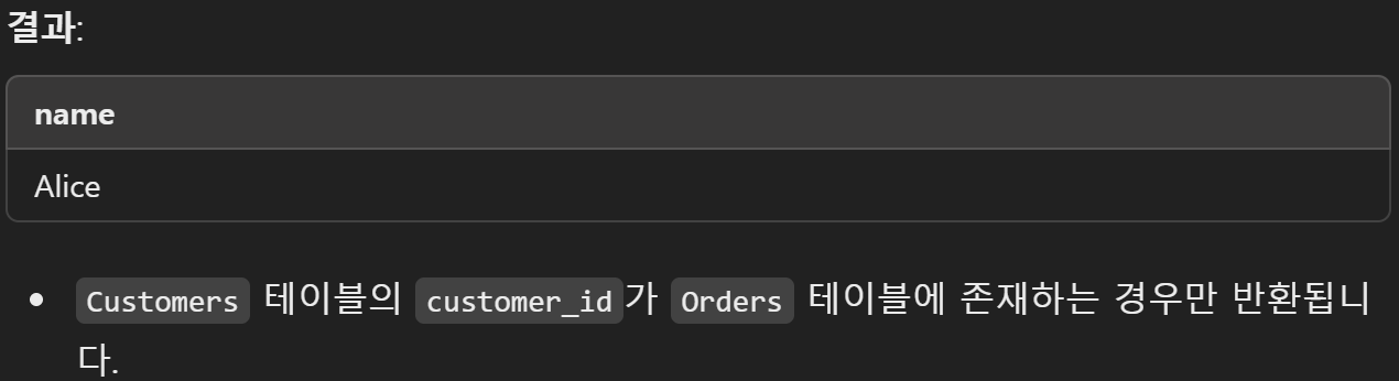 - EXISTS 내부의 쿼리는 실제 데이터를 반환하는 것이 아니라 결과가 존재하는지 여부만 확인.